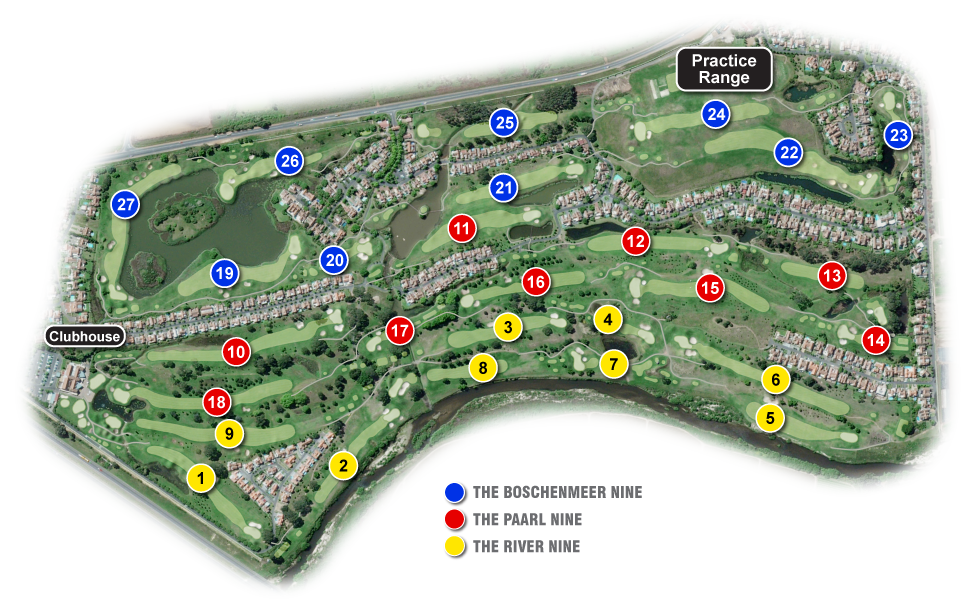 The stunning 27-hole Paarl Golf Course is located in the picturesque valley on the outskirts of Paarl, South Africa's third-oldest town. The course, originally laid out on the banks of the Berg River in the 1950s, was redesigned by Danie Obermeyer and David Frost. David Frost, a Paarl native and still a leading winemaker in the region, brought his local knowledge and experience from the American and European professional golf tours to the course design. The course is a unique 27-hole layout—some holes meander along the Berg River, while others are lush, tree-lined canals that offer the golfer a harmonious blend of risk and reward. The water hazards pose the greatest challenge, with most holes featuring a water trap that requires careful attention from any golfer—even the pros.